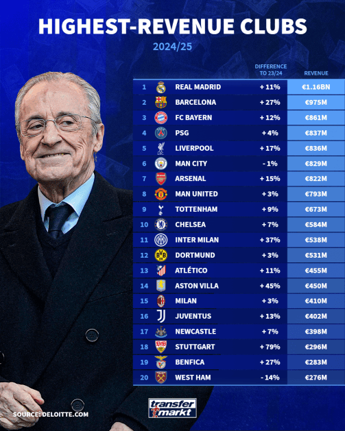 24直播网 在这个场外表现与场上成绩同样重要的时代,全球顶级足球俱乐部们再次展现了它们的财力实力。最新的德勤足球收入排行榜揭示了2024-25赛季中收入最高的20家俱乐部。这...