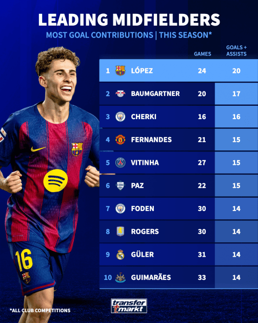 称号:欧洲最佳中场10球10助攻!费尔明参与进球效率碾压亚马尔